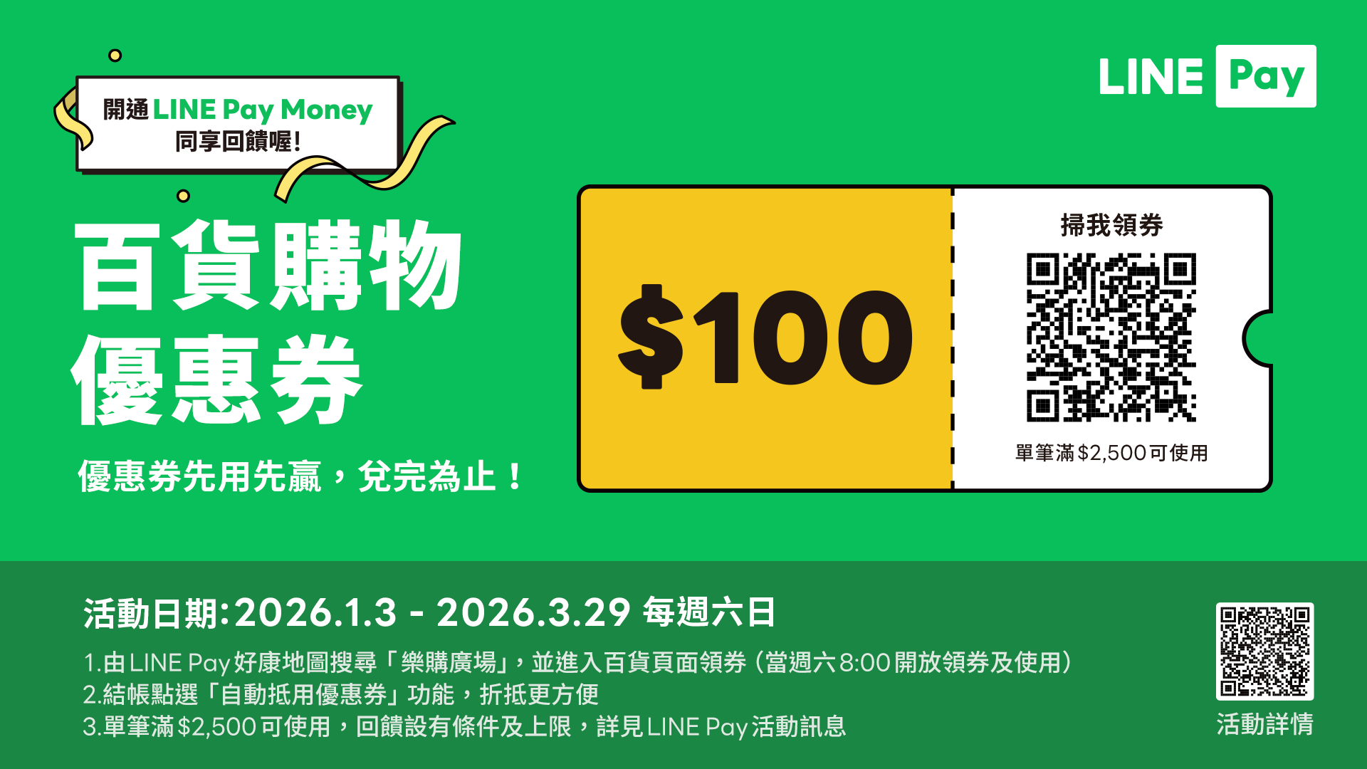 透過LINE Pay好康地圖領取LINE Pay 100元優惠券,用LINE Pay付款單筆滿2,500元即可折抵